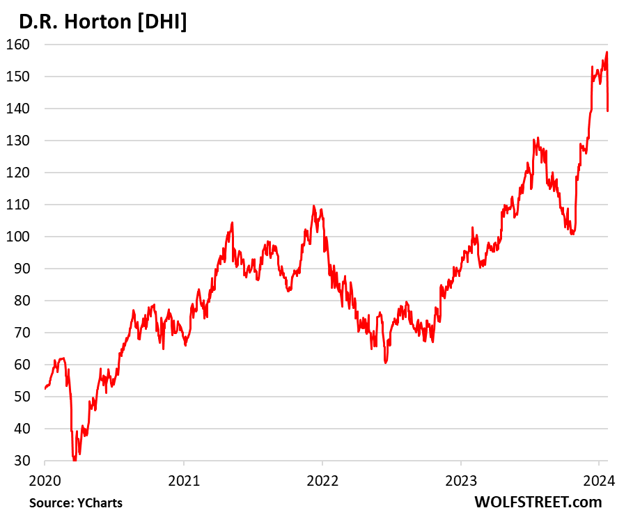 But D.R. Horton’s earnings call had sent homebuilder stocks skidding, now for the second day. D.R. Horton shares [DHI] fell 9.2% yesterday and another 2.7% today, to $139.21, the lowest since December 12. The company disclosed that gross profit margins narrowed by 2.2 percentage points quarter-to-quarter, as the massive costs of mortgage-rate buydowns came home to roost.