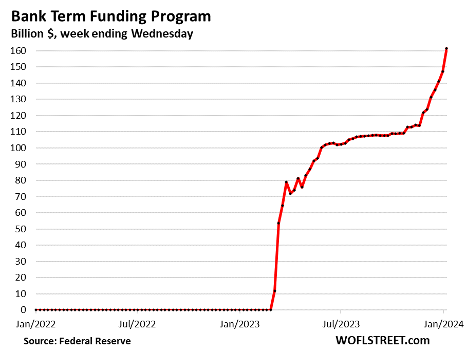 From July through October, the BTFP balance was around $110 billion. But at the beginning of November, it began to surge. Last week, it jumped by $14 billion. Since November 1, it has jumped by nearly 50%, or by $52 billion, to $161 billion.