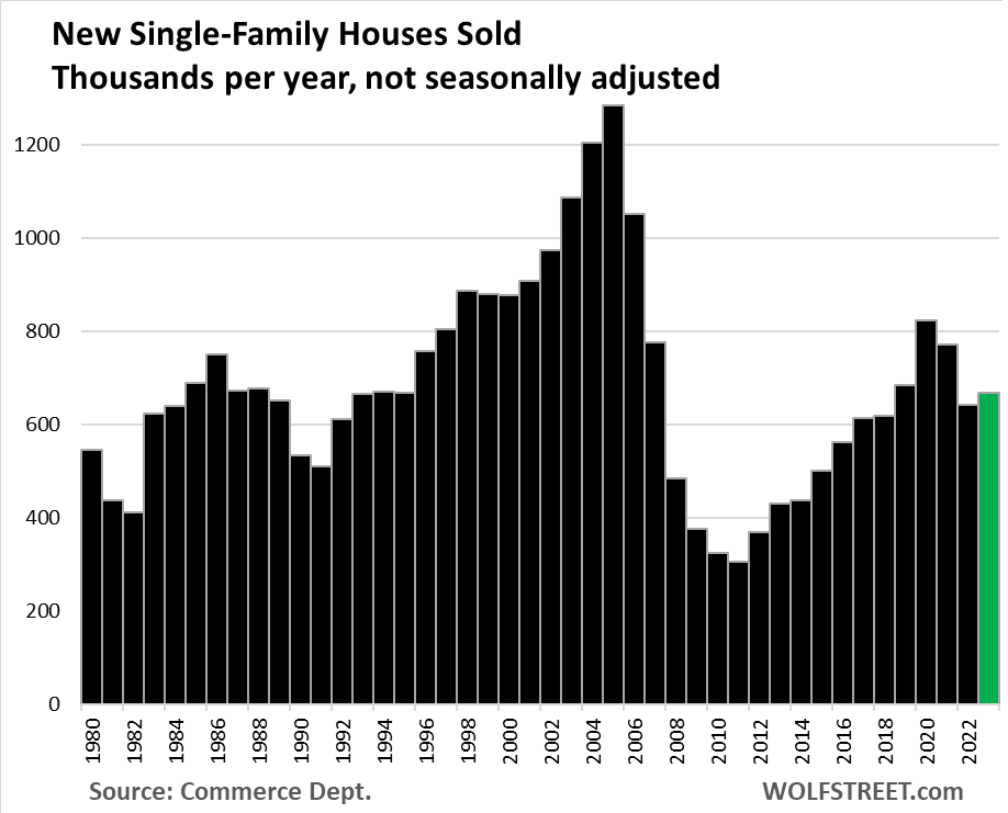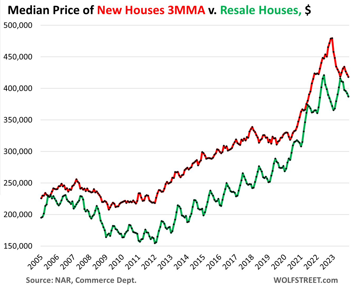 The largest homebuilders have been singing the same song in their earnings calls: This is a tough market where sales of existing homes have collapsed by one-third to just 4 million in 2023, the lowest in the data going back to 1995, from the normal level of around 6 million per year, but we, the homebuilders, know how to deal with this market. We’re building smaller houses with less costly amenities that we sell at lower prices, and we’re buying down mortgage rates at a considerable cost to us, and we’re hedging those buydowns, and when those hedges blow up, that costs us too, and we’re throwing other incentives at buyers, so that we can get the payment down. And now people can buy a new house for a lower mortgage payment than a resale home. And we’re competing with homeowners and taking sales away from them.