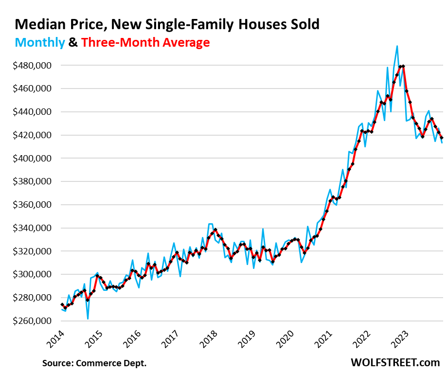 The median price of new single-family houses sold in December dropped to $413,200, down by about 17% from the peak in October 2022, and the lowest since December 2021, according to the Commerce Department today (blue).