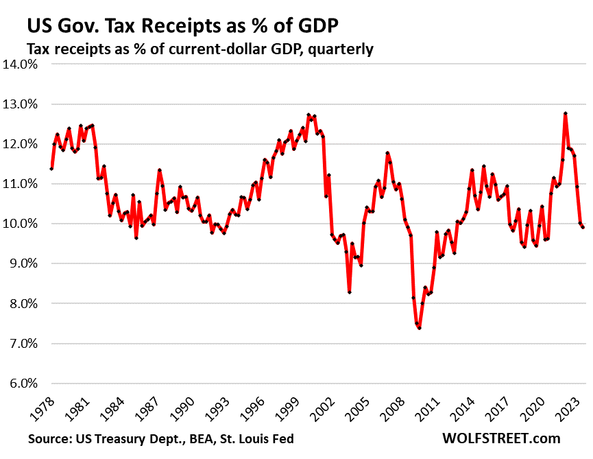 Inflation boosts current-dollar tax receipts and current-dollar GDP but it doesn’t affect the existing debt. The existing debt is fixed, it’s Treasury securities that are out there. Only newly added debt is impacted by inflation. So the burden of the debt declines. But in 2023, there wasn’t enough inflation. There was enough in 2021 and 2022, and you can see the Debt-to-GDP ratio declined. So maybe in 2024, this gets rectified with higher inflation.