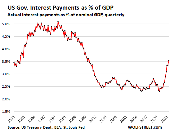 The spike in Q2 2020 to 133% had occurred largely because GDP had collapsed, and to a lesser extent because the debt had begun to jump. Then, as the economy leaped out of the hole and then grew faster than the debt through Q1 2023, the Debt-to-GDP ratio declined.