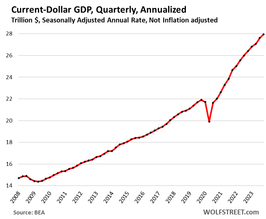 This is the size of the economy: Current-dollar GDP (not adjusted for inflation) in Q4 rose by 5.8% year-over-year to $27.9 trillion, according to the Bureau of Economic Analysis on Thursday: The Year of the Recession that Didn’t Come. Over the past four years, it grew by 27.6%.