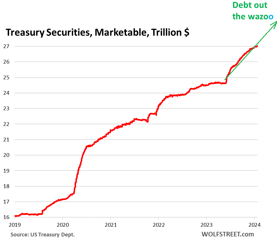 As of today, marketable Treasury securities are $27.0 trillion, up from $24.7 trillion at the beginning of Q3 2023. And if the “Marketable Borrowing Estimates” estimates today for Q1 are on target, marketable securities will be at $27.8 trillion by March 31.