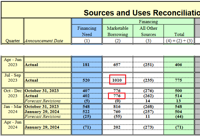 Maybe I’m misunderstanding, but the 1.010T number has been out there as an “actual” number for a while now–it was on the October 2023 Sources and Uses Reconciliation Table, and it’s there again on today’s table. One might reasonably believe it’s an actual representation of what the Treasury added to marketable securities in Q3 2023.