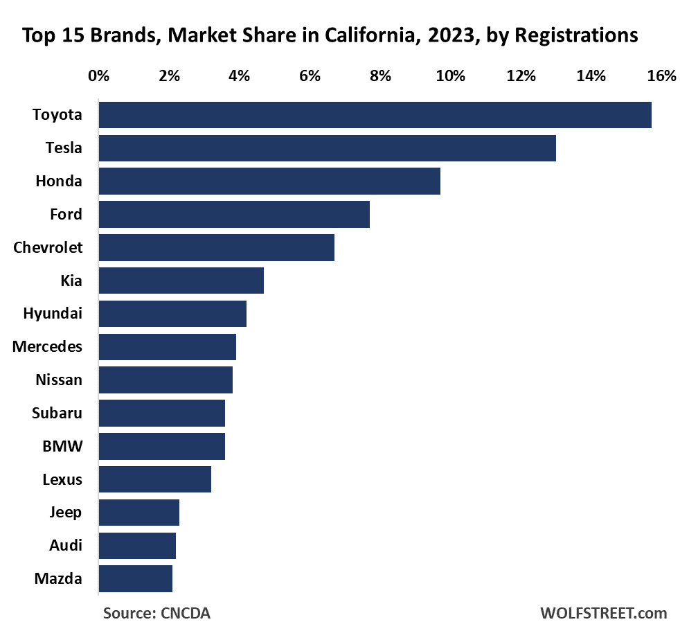 Tesla’s share of all light vehicles sold in California in 2023 surged to 13.0%, behind only Toyota, whose share fell to 15.7% (from 17.3% in 2022), according to the California New Car Dealer Association, based on registrations data by Experian. Honda was #3 with a share of 9.7%. Toyota and Honda had ruled California before the arrival of Tesla.