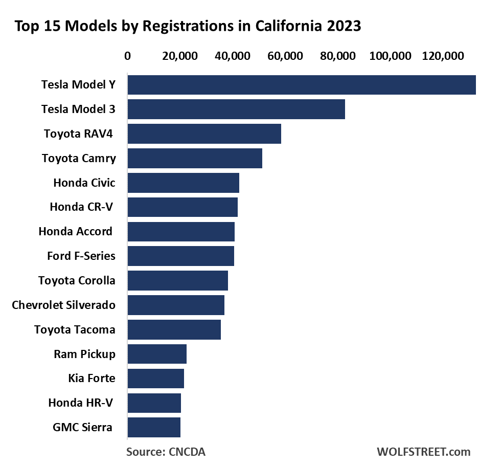 Tesla’s Model Y and Model 3 were by far the #1 and #2 bestsellers in California in 2023 by registrations, far ahead of the next models in line: Model Y sales spiked by 52% to 132,636; Model 3 sales rose by 4.9% to 82,786.