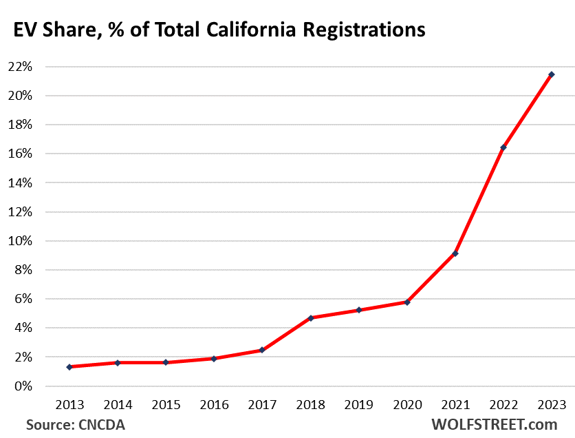 The share of EVs in California – it jumped to 21.4% in 2023, up from 5.8% in 2020 — experienced two big accelerations: in 2018 when Model 3 production got scaled up; and in 2021, when the Model Y production reached scale: