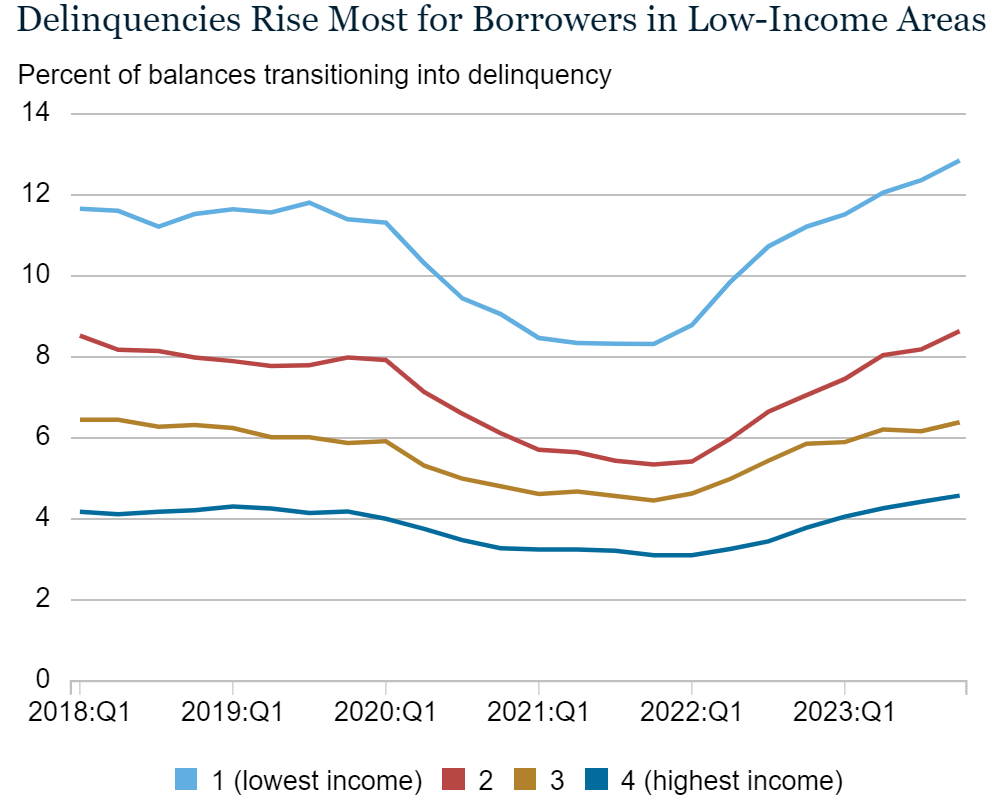 In a blog post, the New York Fed grouped the delinquencies by zip codes into four income categories from lowest-income zip codes to highest-income zip codes, and found that delinquency rates drop as income levels rise. In addition, it found:
