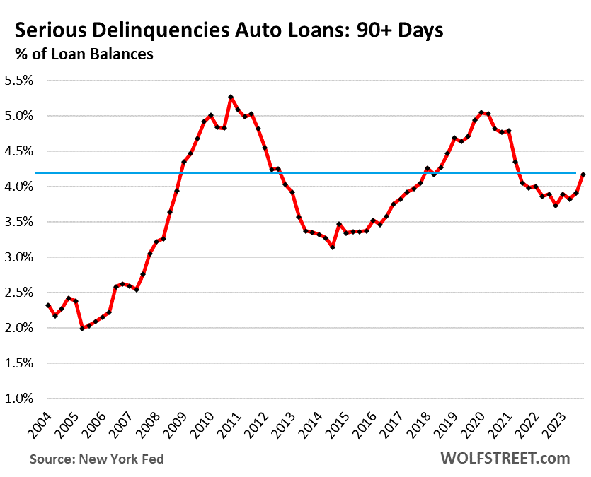 The 90-plus-day delinquency rate – auto loans and leases that are 90 days or more past due by the end of Q4 – rose to 4.2%: