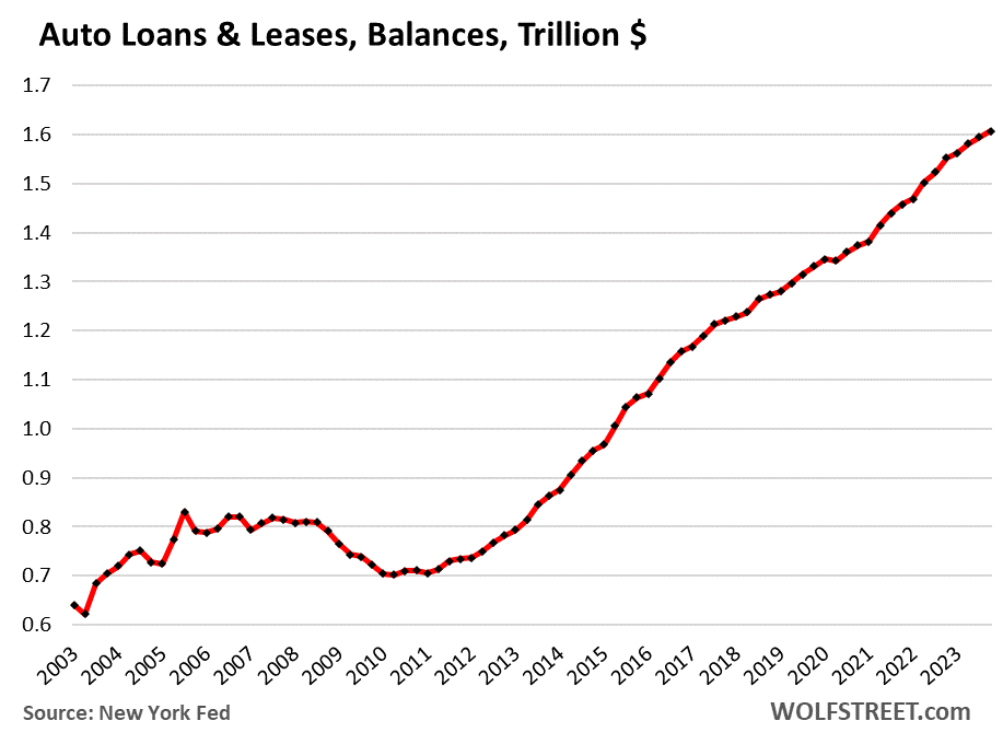 The balance of auto loans and leases rose by 0.8% in Q4 from Q3, and by 3.5% year-over-year, to $1.61 trillion, according to data from the New York Fed’s Household Debt and Credit Report.