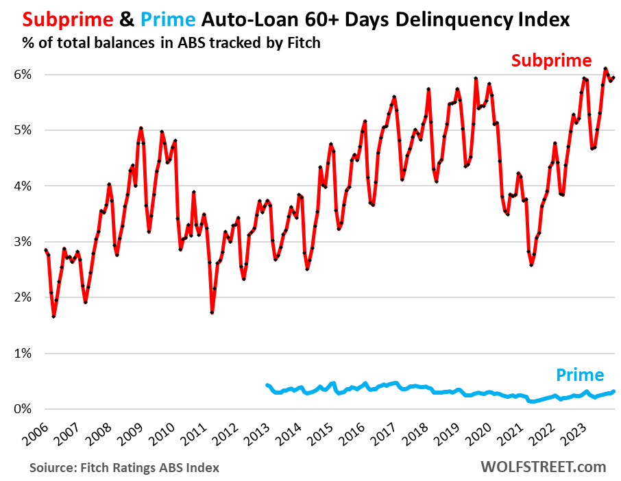 Subprime loans that are at least 60 days delinquent had hit a record in September but have since then backed off a little and in December were at 5.9% of total loan balances (red line in the chart below), according to the auto loans backing the ABS that are tracked by Fitch Ratings.