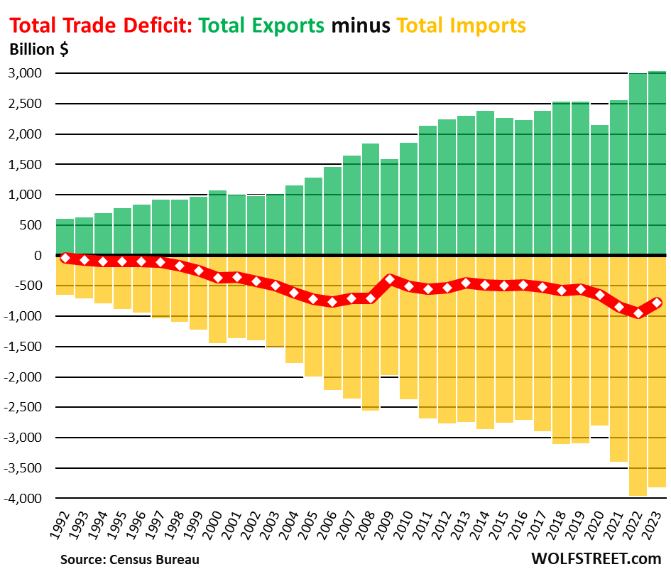 The chart shows just how huge international trade is for the US, with over $3 trillion in exports of goods and services in 2023 (green, added to GDP), and nearly $4 trillion in imports of goods and services (yellow, subtracted from GDP). The red line represents the trade deficit, total exports minus total imports.