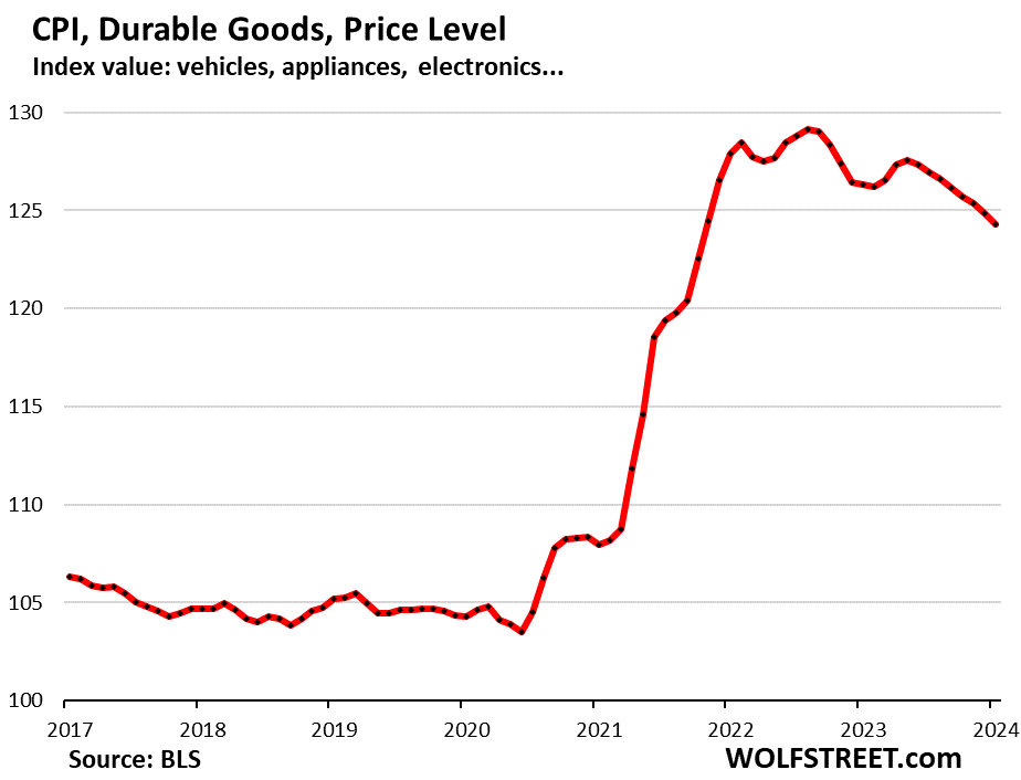 And growth in spending on goods, adjusted for inflation, started slowing in 2022 from the pandemic free-money binge, and sometimes turned negative from the spending binge during the pandemic, but has held up surprisingly well, even in durable goods against all expectations. And “real” spending on goods is still running far above prepandemic trend, which was one of the factors why GDP was surprisingly strong in 2023.
