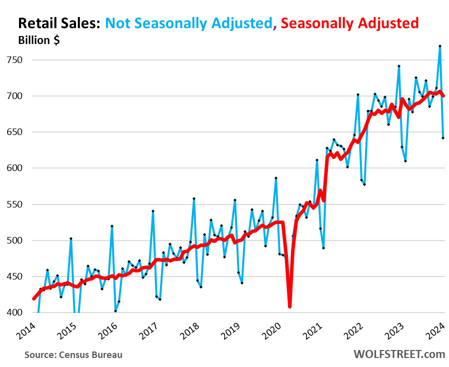 Seasonally adjusted, retail sales dropped by 0.8% from December, to $700 billion ( = $642 billion in actual sales + $58 billion in seasonal adjustments). That seasonally adjusted total was up by 0.6% from the seasonally adjusted total in January 2023.