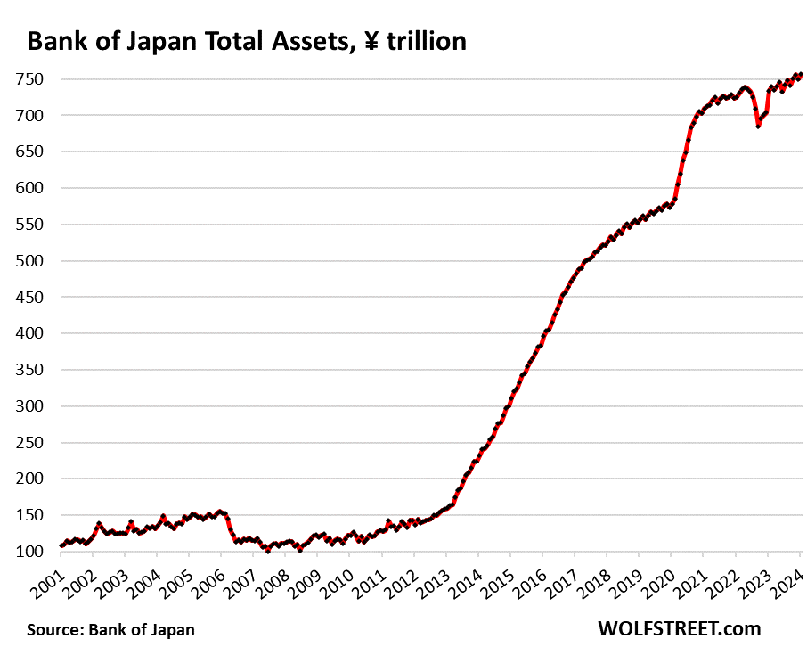 “From the beginning of Abenomics in 2012 through today, the Bank of Japan engaged in a huge money printing spree, during which it took its total assets from ¥150 trillion to ¥756 trillion.”