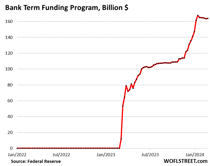 Since then, the BTFP has declined by $3.7 billion, to $164 billion. The facility will cease making new loans, as scheduled, on March 11, but existing loans can be maintained for up to one year after the loan was issued. So at the latest by March 11, 2025, the BTFP will go to zero.