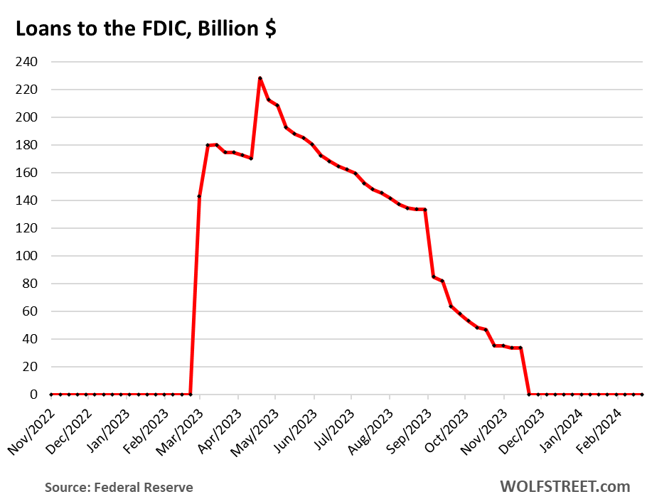 Loans to FDIC: $0. This facility was put together over the panicky weekend in March. The funding allowed the FDIC to quickly make whole all depositors – not just the insured depositors – of the failed banks, before it could sell the failed banks’ assets. The FDIC paid off the remainder in November.