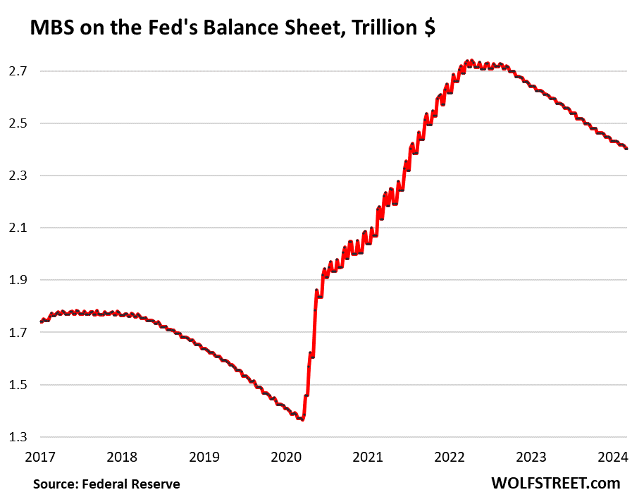 All of this dramatically slowed the pass-through principal payments to MBS holders, and so the MBS are coming off the balance sheet only at a glacial pace that’s far below the $35-billion cap.