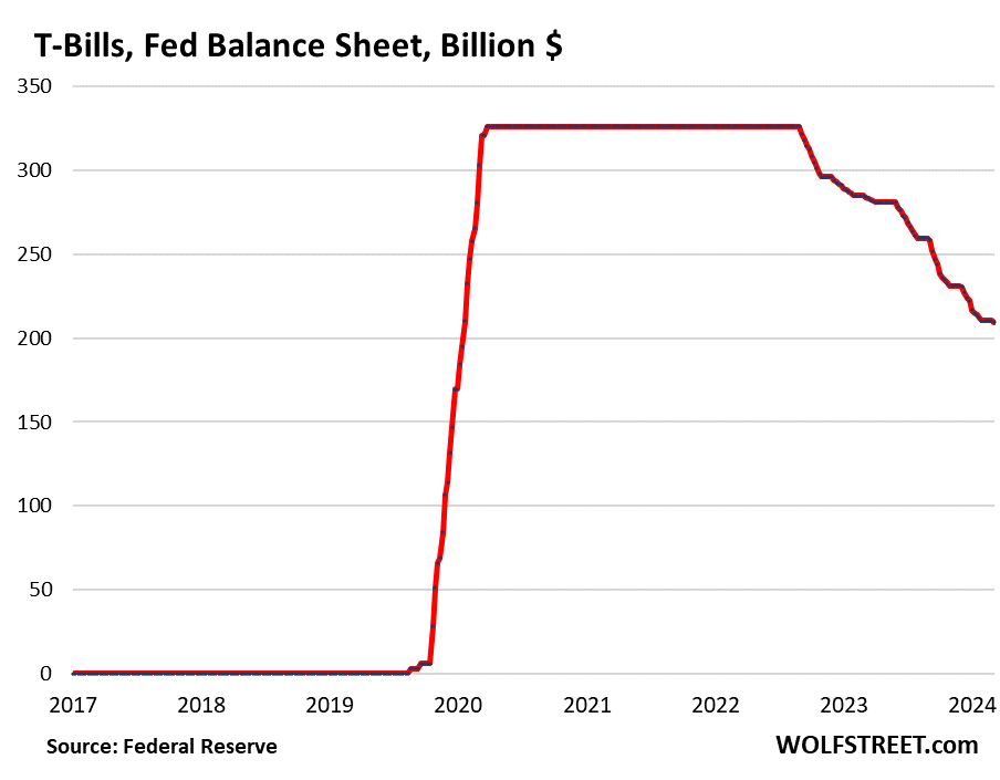 The Fed lets them roll off (doesn’t replace them when they mature) if not enough longer-term Treasury securities mature to get to the $60-billion monthly cap. As long as the Fed has T-bills, the roll-off of Treasury securities can reach the cap of $60 billion every month.