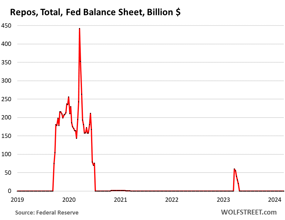 Repos: $0. The Fed currently charges counterparties 5.5% on repos, as part of its five policy rates. The Fed’s repos come in two flavors: