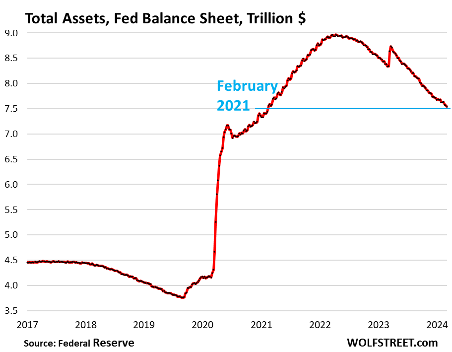 Total assets on the Fed’s balance sheet dropped by $91 billion in February, to $7.54 trillion, the lowest since February 2021, according to the Fed’s weekly balance sheet today.