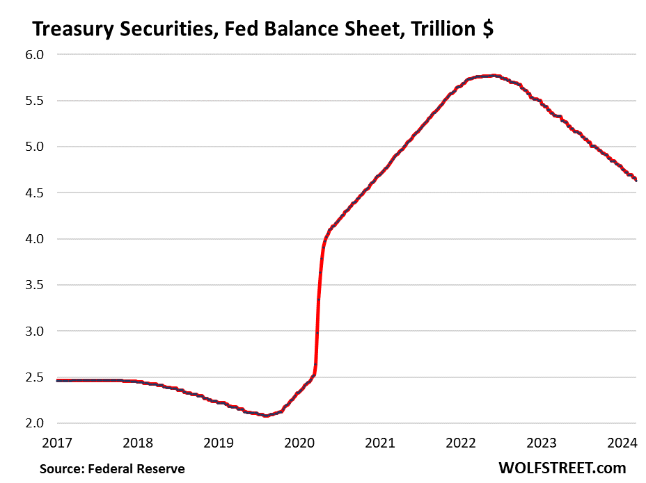 Treasury securities: -$61 billion in February, -$1.14 trillion from peak in June 2022, to $4.63 trillion, the lowest since December 2020.