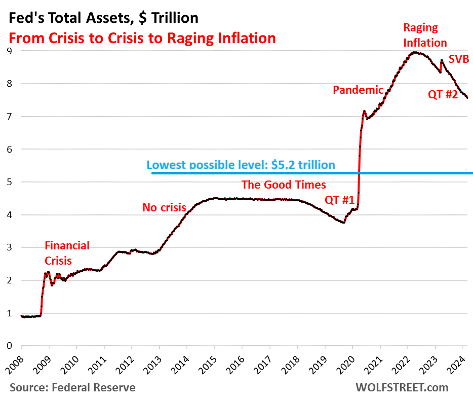 The LPL is set by the Fed’s liabilities, which is what the linked article is all about. Two of the four big liabilities are outside the Fed’s influence, and both are growing (cash in circulation and the government’s checking account). The third will go to zero (ON RRPs). And the fourth will decline (reserves), but it cannot go to zero. How low can it go? No one knows, the Fed said. But this is where I calculated the LPL will be, and it’s a long way to go, and it will take years to get there, and it will require that the Fed slows down the roll-off because it’s sucking a lot of liquidity out, and if it sucks too quickly, liquidity will not be able to flow where it’s need and something will blow up which will then be the end of QT. The blow-up would happen well before the $5.2 trillion.
