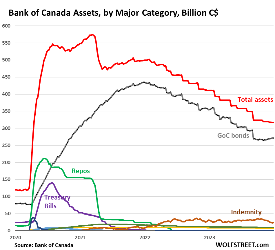 Under its QT program, the BoC has so far shed 46% of its securities at the peak. This amounts to having shed 59% of the securities it had added during its pandemic QE.