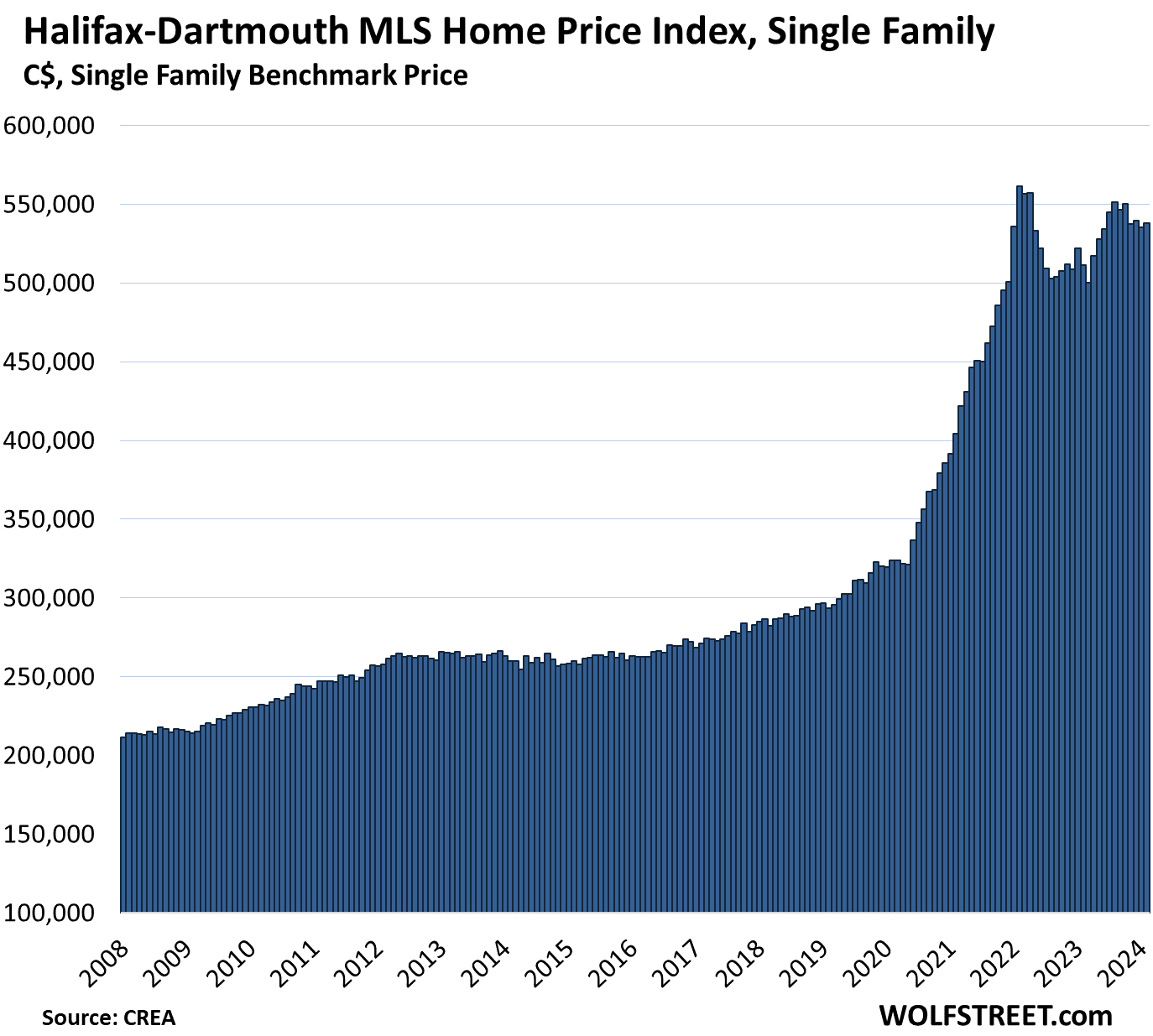 Halifax-Dartmouth: The single-family benchmark price rose 0.5%, to $538,200; in essence unchanged for the past four months.