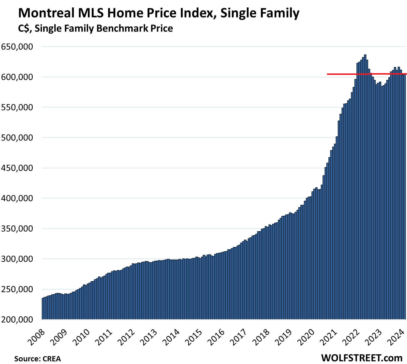 Montreal: The single-family benchmark price edged up 0.2% for the month to $604,700 seasonally adjusted.