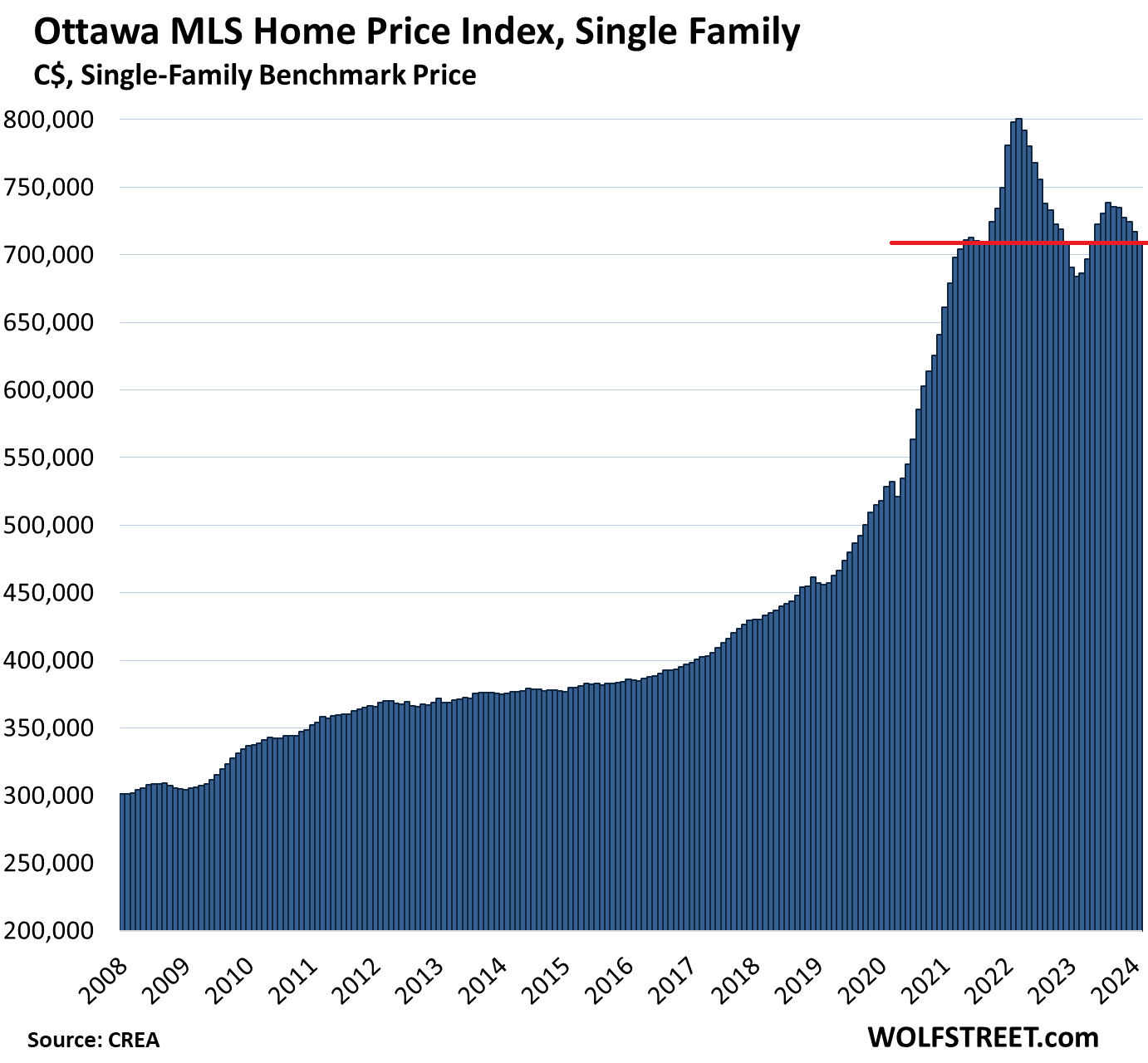 Ottawa: The benchmark price of single-family houses fell by 1.2% for the month, to $708,800, below where they’d first been in March 2021: