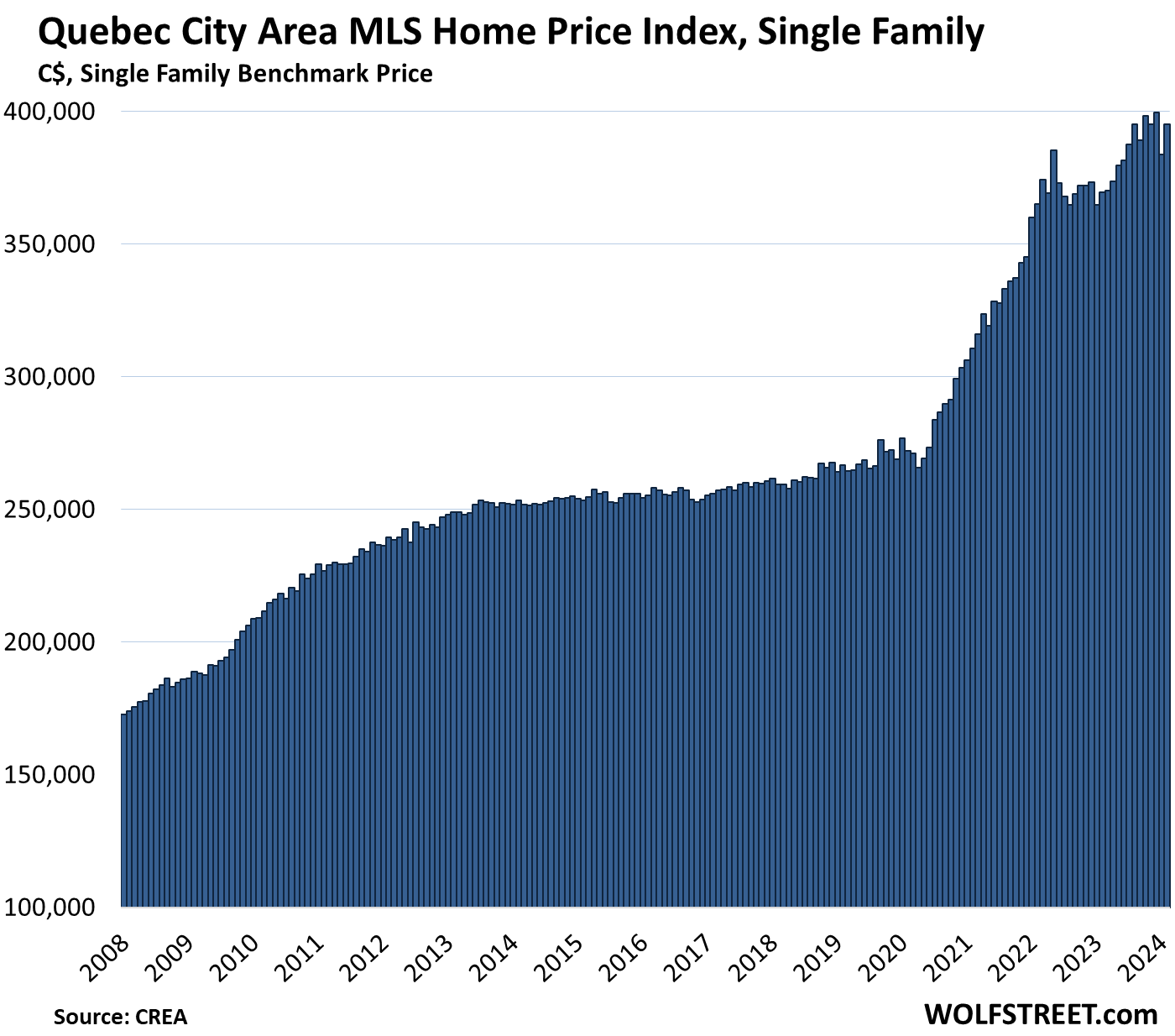 Quebec City Area: The single-family benchmark price jumped 2.9% for the month, to $395,000, after having dropped by 3.9% in the prior month. It was up by 6.9% year-over-year: