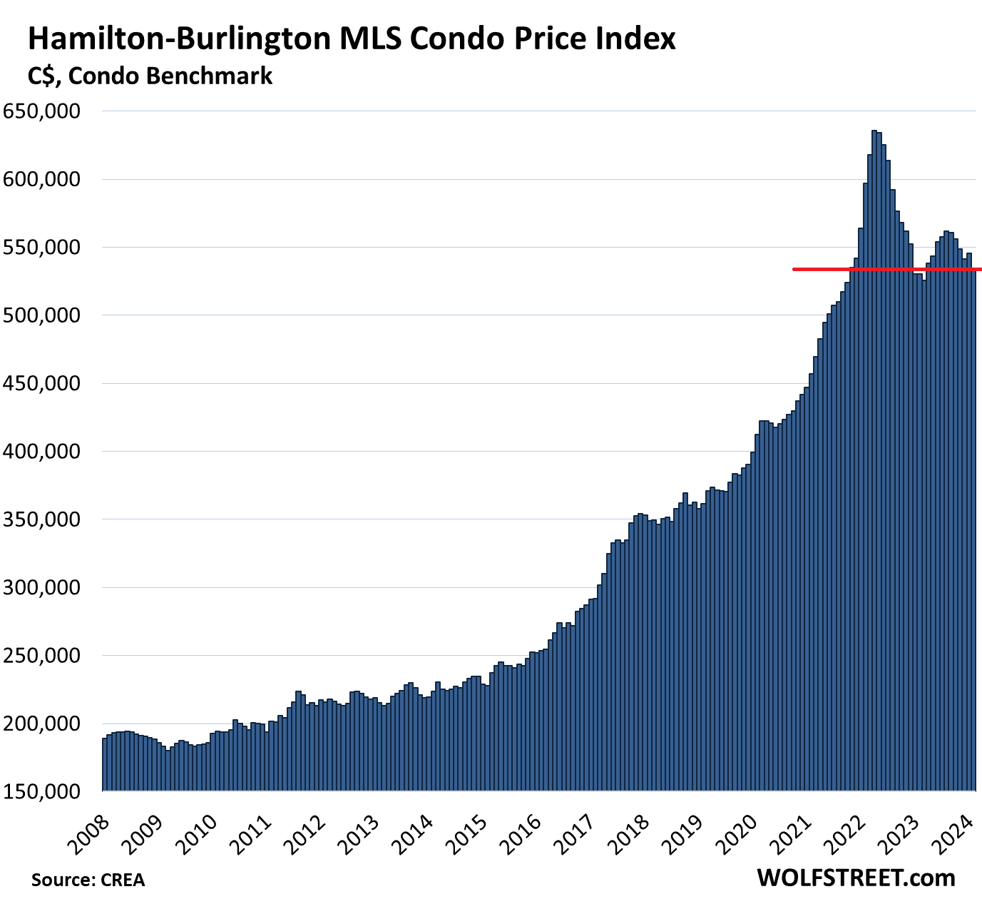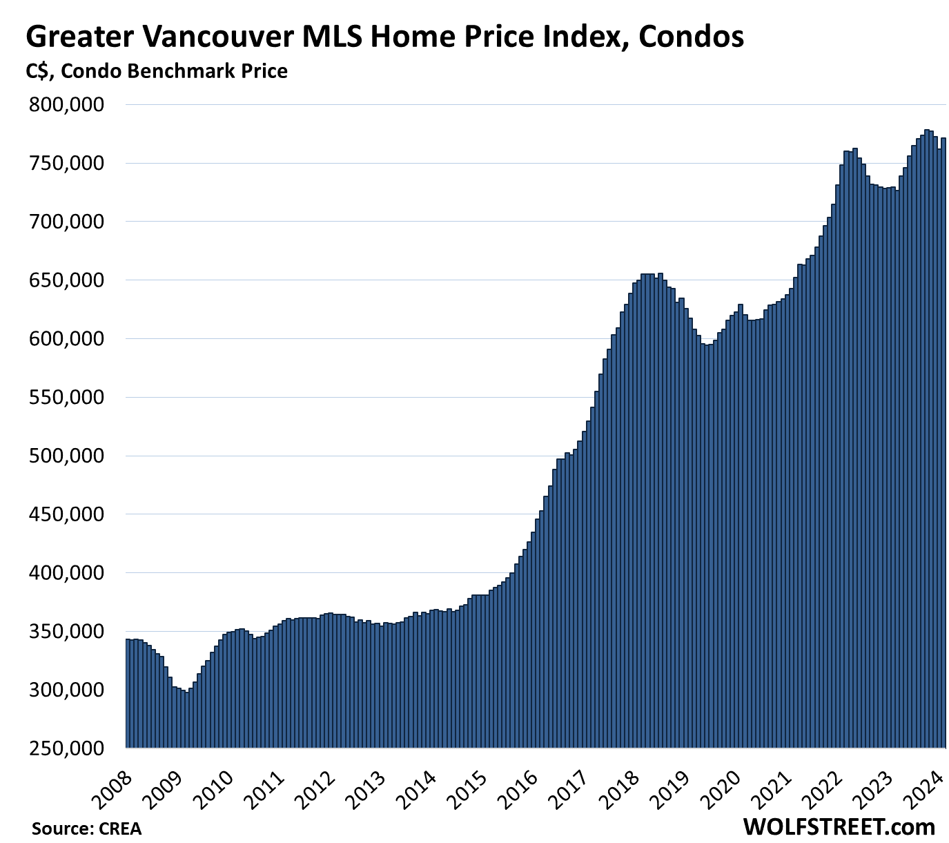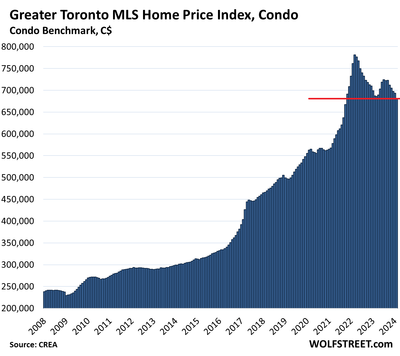 Greater Toronto Area, Condos: Prices fell 0.8% in February from January, to $681,700, down by 0.8% from February 2023, and down by 12.7% from the peak in February 2022, and the lowest since October 2021: