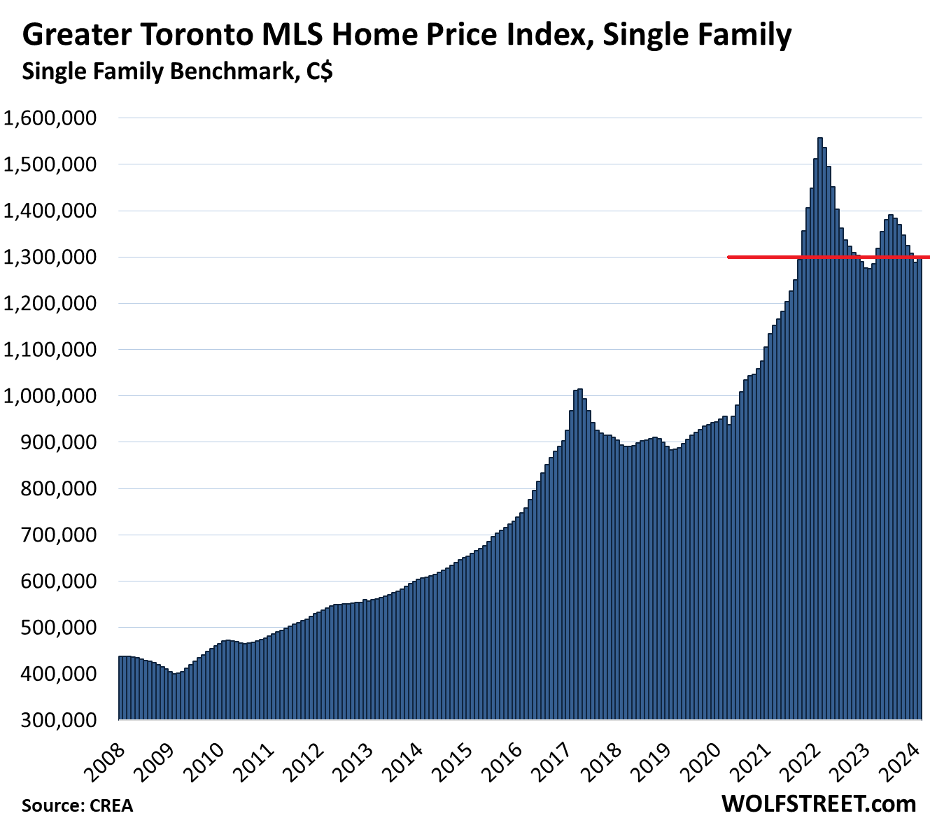 In dollar terms, the Benchmark Index for single-family houses has fallen by $145,500 from the peak in February 2022, to $788,800, just above where it had first been in August 2021 (all amounts in Canadian dollars). But there was a wide divergence between the major markets, and between houses and condos in some markets. And we’ll get to them.