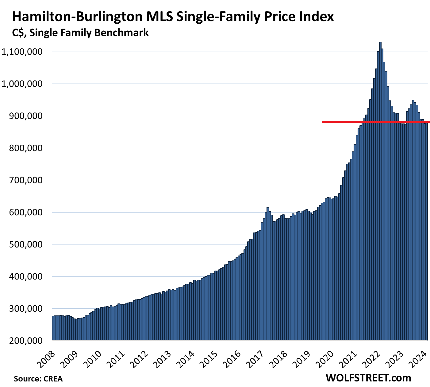 Hamilton-Burlington metro (part of the “Greater Toronto and Hamilton Area”): The single-family benchmark price rose by 0.9% in February from January, to $882,700 seasonally adjusted.