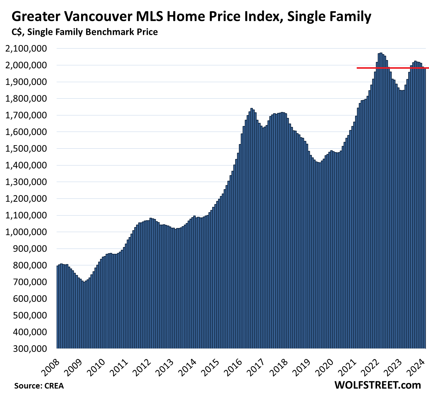 Greater Vancouver single-family: The benchmark price for single-family houses dipped 0.1% for the month, to $1,986,700 seasonally adjusted: