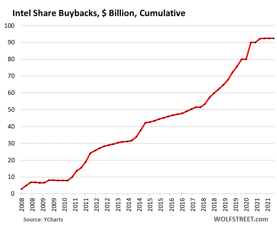 If Intel hadn’t wasted $94 billion in cash on share buybacks to enrich its shareholders, it would now have the $94 billion in cash for its $100 billion investment, or it could have invested the $94 billion years ago in US-based research, development, and manufacturing plants, and it wouldn’t be so far behind now.