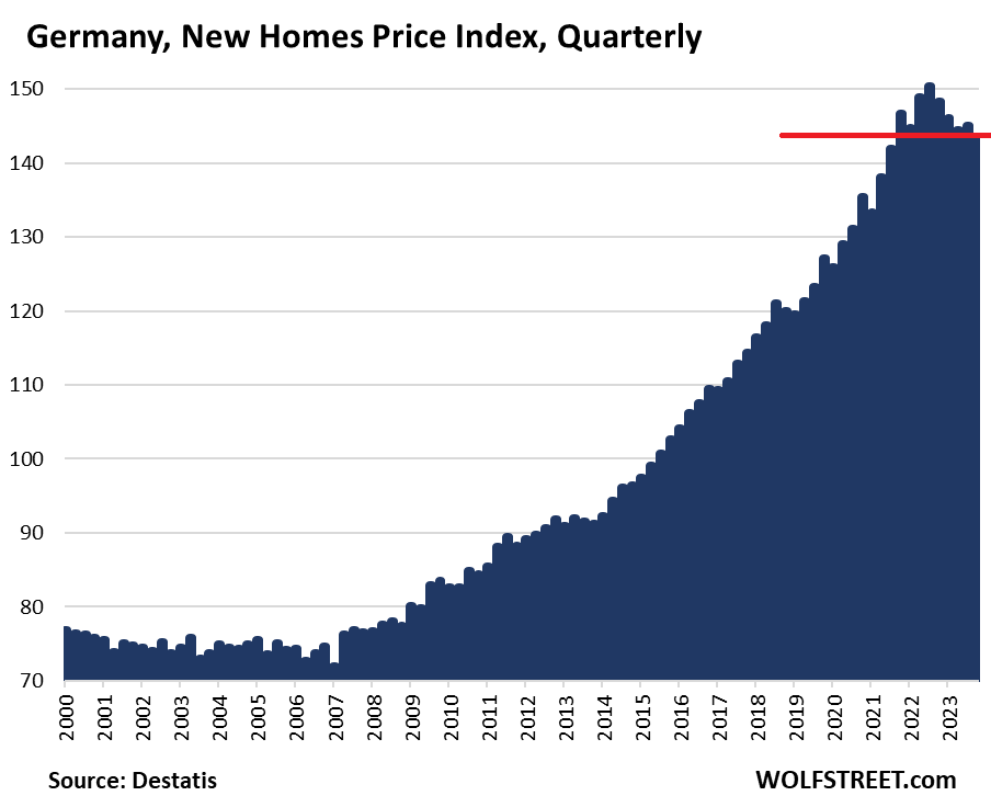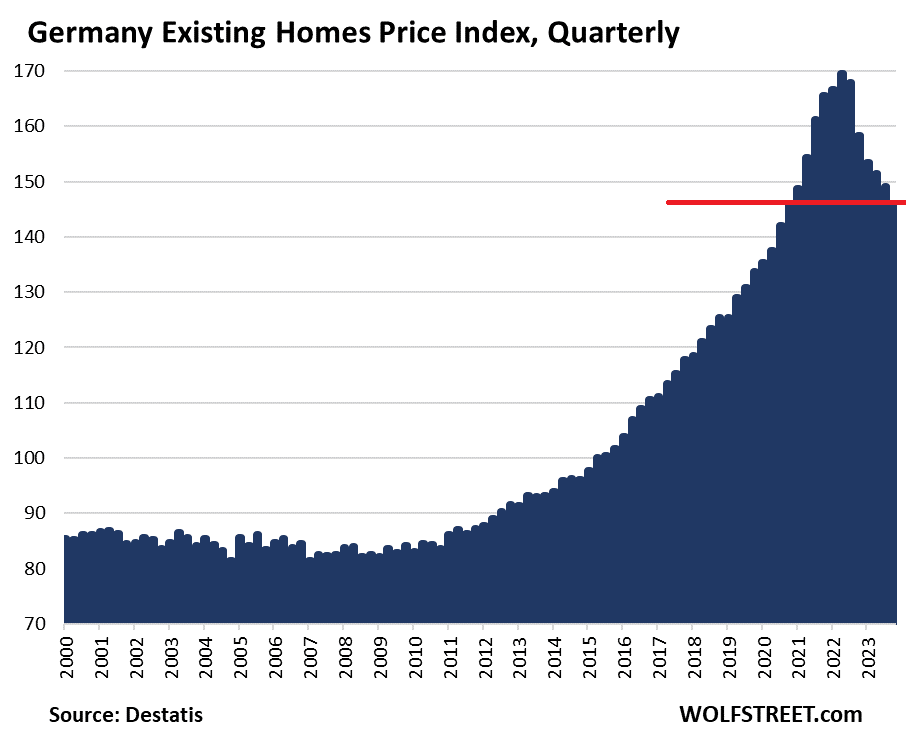 Prices of existing homes in Germany – used single-family houses, duplexes, and condos – that were sold in Q4 have now dropped by 14% from the peak in Q2 2022, according to data from the German statistical agency Destatis today. The index has now unwound all the gains since Q4 2020. These are the biggest drops in the data going back to 2000.