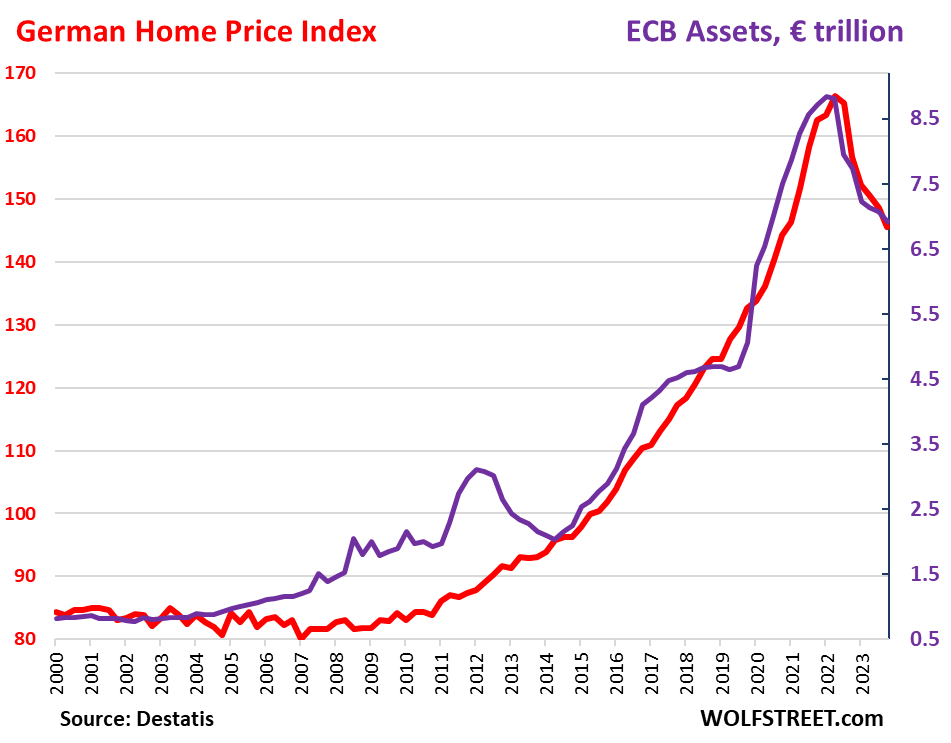 On the way down, the home price index has dropped by 12.6% from the peak, while the ECB’s balance sheet has dropped by 21.7% (by €2.0 trillion) from the peak.