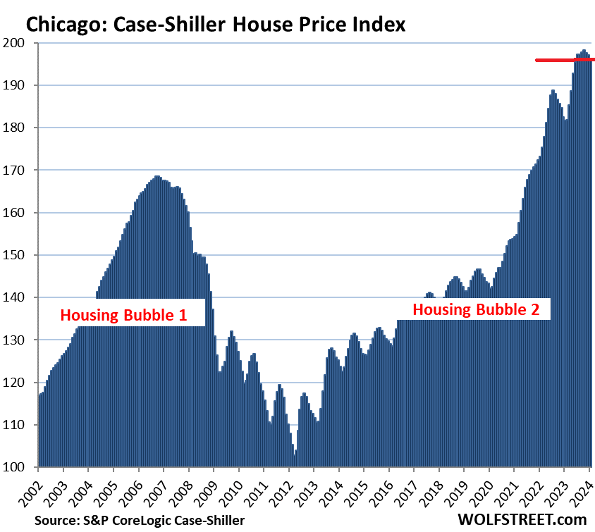 Chicago, with an index value of 196 is up by 96% from 2000, and therefore is a far cry from qualifying for this list of the Most Splendid Housing Bubbles, but prices shot up majestically between May 2020 and October 2023, and so here is Chicago anyway: