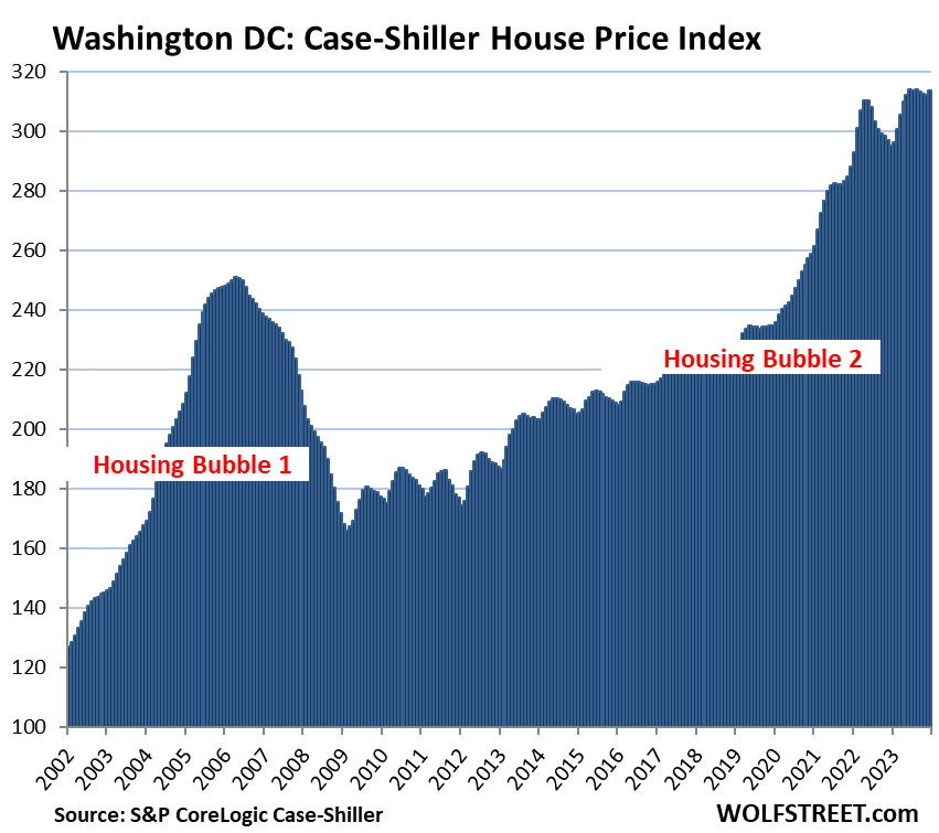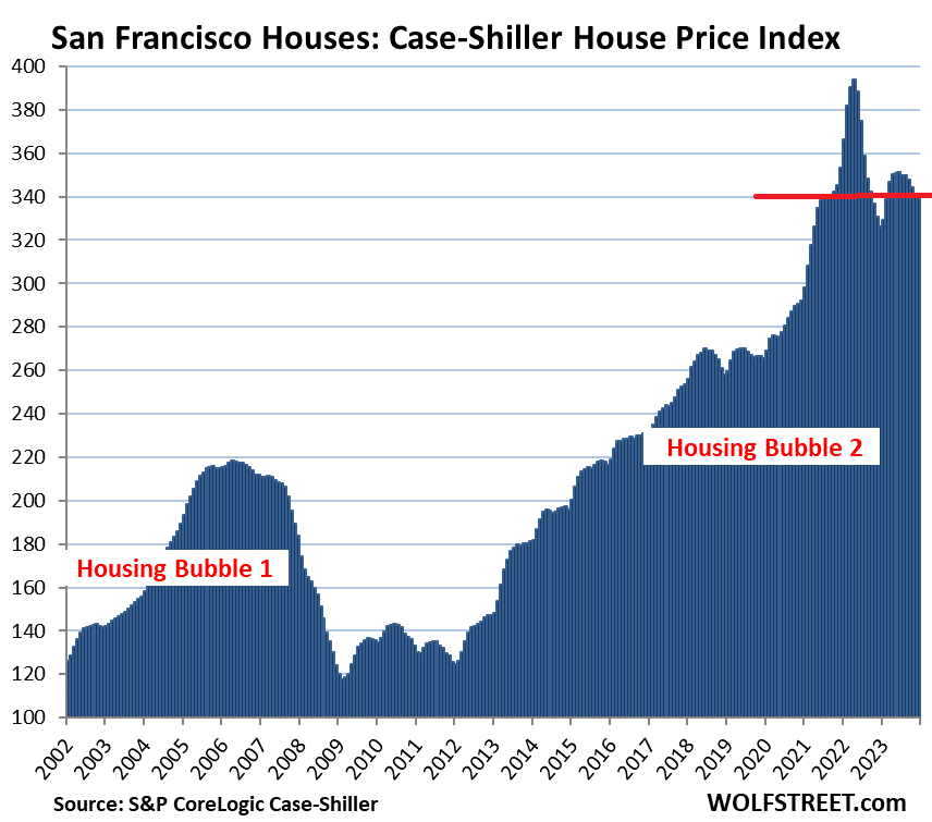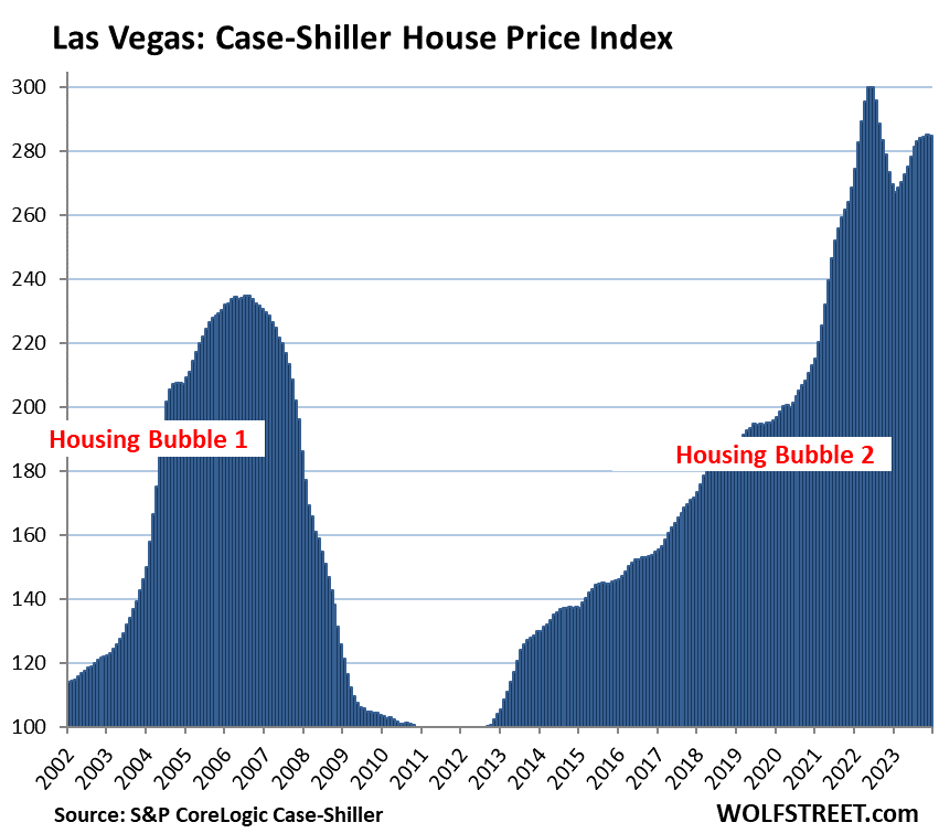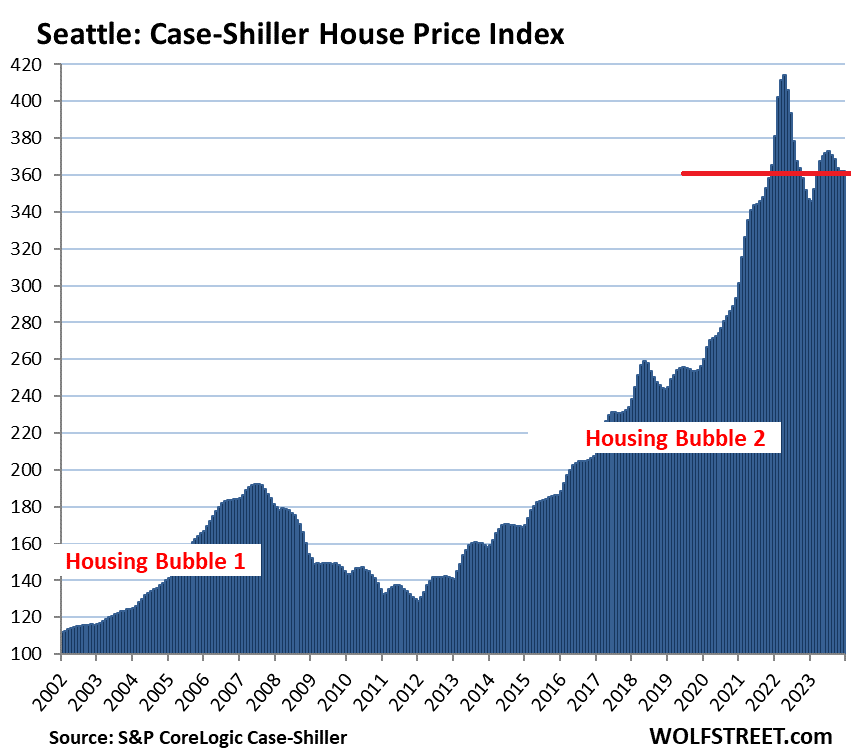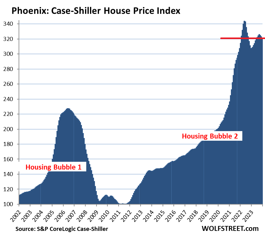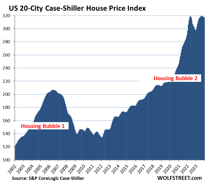 The long view of the 20-Cities Index shows the mind-blowing surge over the past few years; and it shows a bizarre non-seasonal double top that has never occurred in the history of the index, with the first top in June 2022 and the second top in October 2023.