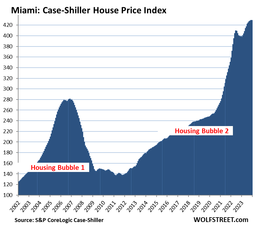 To qualify for the Most Splendid Housing Bubbles, the metro must have experienced home-price inflation since 2000 of at least 180%. The indices were set at 100 for the year 2000. Today’s index value for Miami, which we’ll get to in a moment, of 429 is up 329% since 2000, making Miami the most splendid housing bubble on this list.