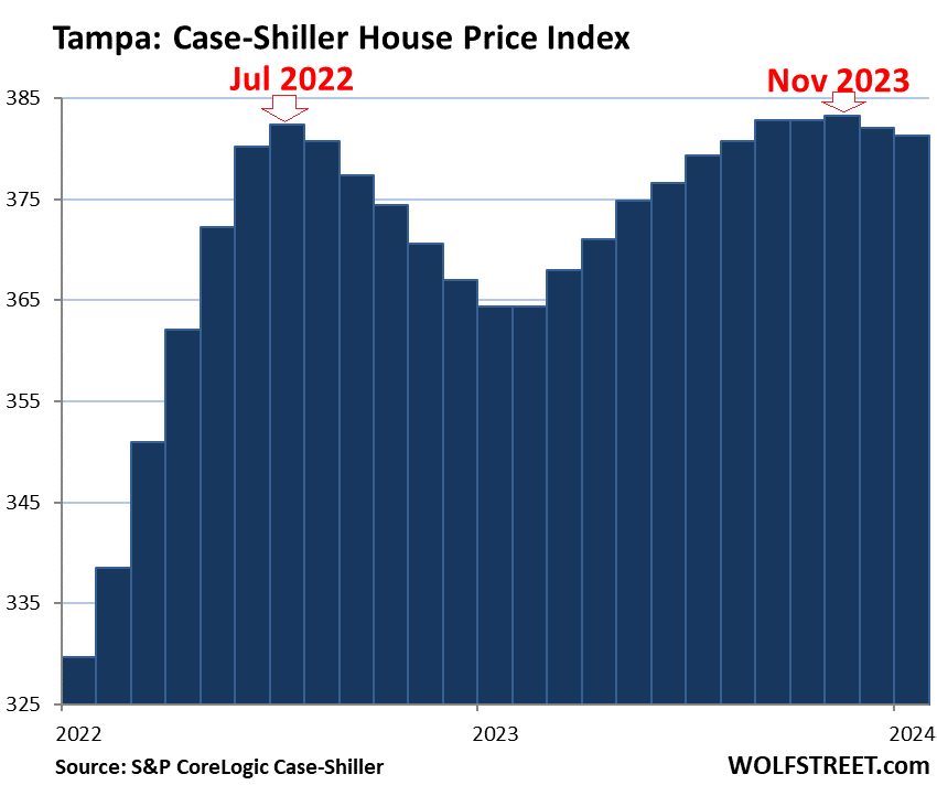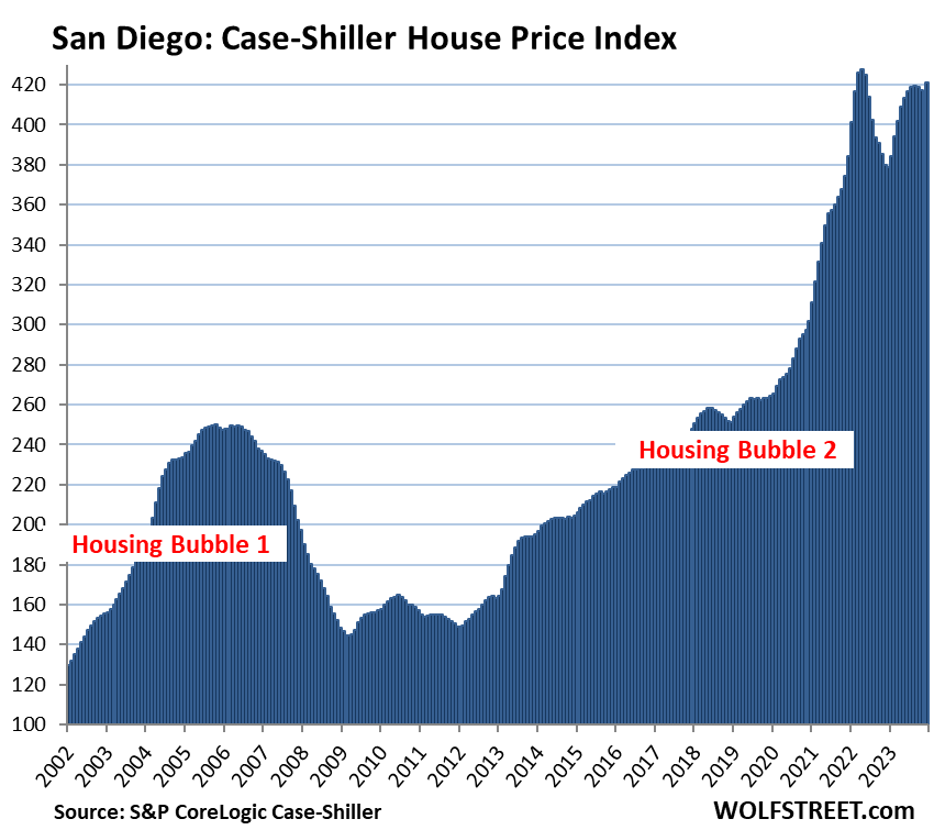 It explains that the double peaks are NOT seasonal. In San Diego, which has zero seasonality in the CS, the all-time high was in May 2022, and it still holds. The second peak was in September, and now there is this January bounce, which remains below the all-time high of May 2022 and below September 2023. These two highs are 16 months apart, not 12 months, nothing lines up seasonally because there are no seasons in the CS for San Diego. And there is a trough in between that is not seasonal because the CS for San Diego has zero seasonality. And the bottom of that nonseasonal trough is January 2023. And so now January lines up with the trough that is not seasonal. So you will see the year-over-year increase get eaten up in the coming months. That’s why year-over-year is meaningless, unless the data is very seasonal. Which is why I give you a picture so I don’t have to listen to this BS.