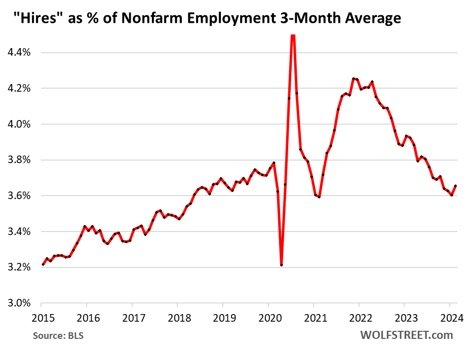 Hires rose to 5.82 million, the most since September. As a percent of nonfarm employment, hires rose to 3,7%, also the highest since September. The three-month average rose to 3.7%, first increase since September: