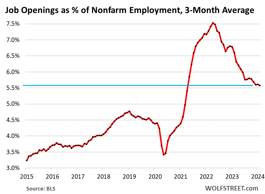 In February, job openings rose to 5.6% of nonfarm employment, compared to 4.8% during the tightest month before the pandemic, and the percentage has been stable at this level over the past five months. The three-month average has been stable for three months at around 5.6%: