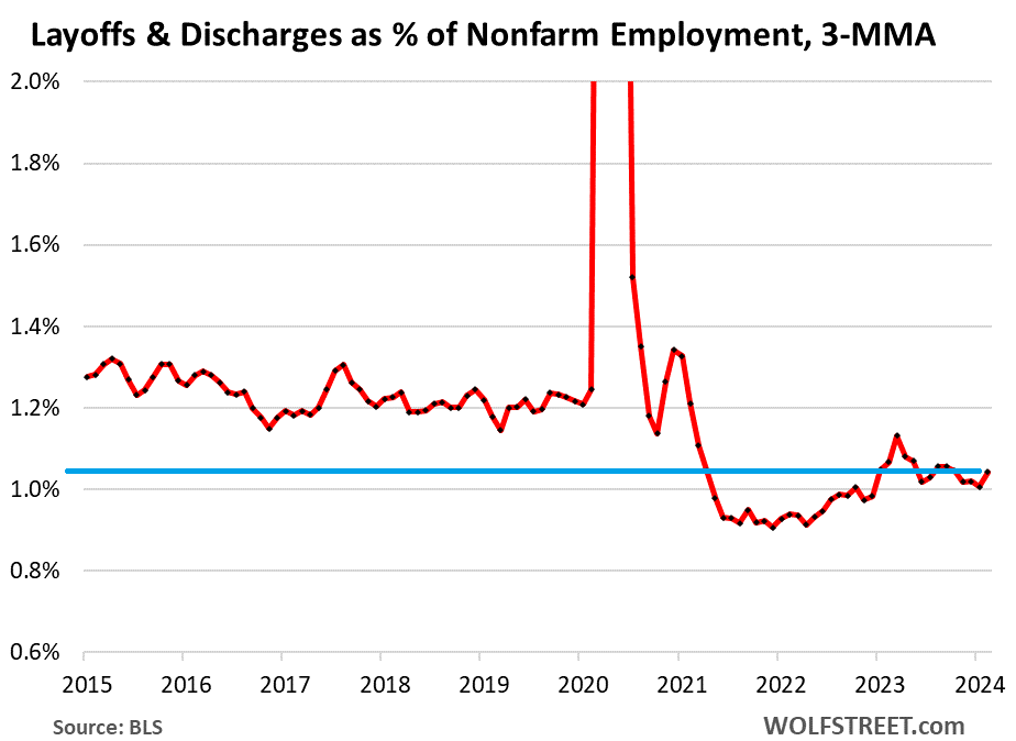 Layoffs and discharges as a percent of nonfarm employment ticked up to 1.04%. Before the pandemic, this ratio was around 1.2%. During the pandemic layoffs in the spring of 2020, it spiked to nearly 6%, then plunged to 0.9% as labor shortages defined the labor market.