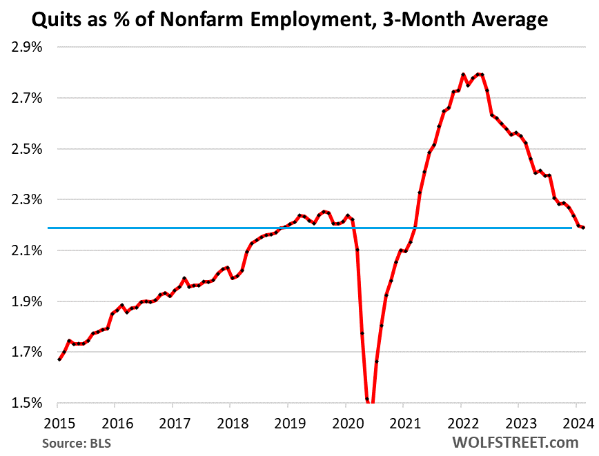 In February, job openings ticked up to 8.76 million, up by 25% from the already fairly high levels in 2019, indicating a still hot employment environment. But the massive churn that prevailed during the pandemic has calmed down.