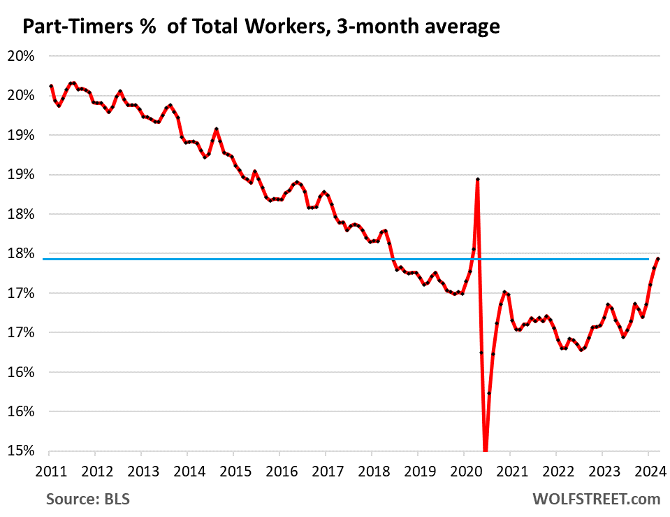 Part-time workers as percent of total workers had hit historic lows during the labor shortages in 2021 and 2022 but have since then risen, and remain very low historically, at 17.4% (three-month average):