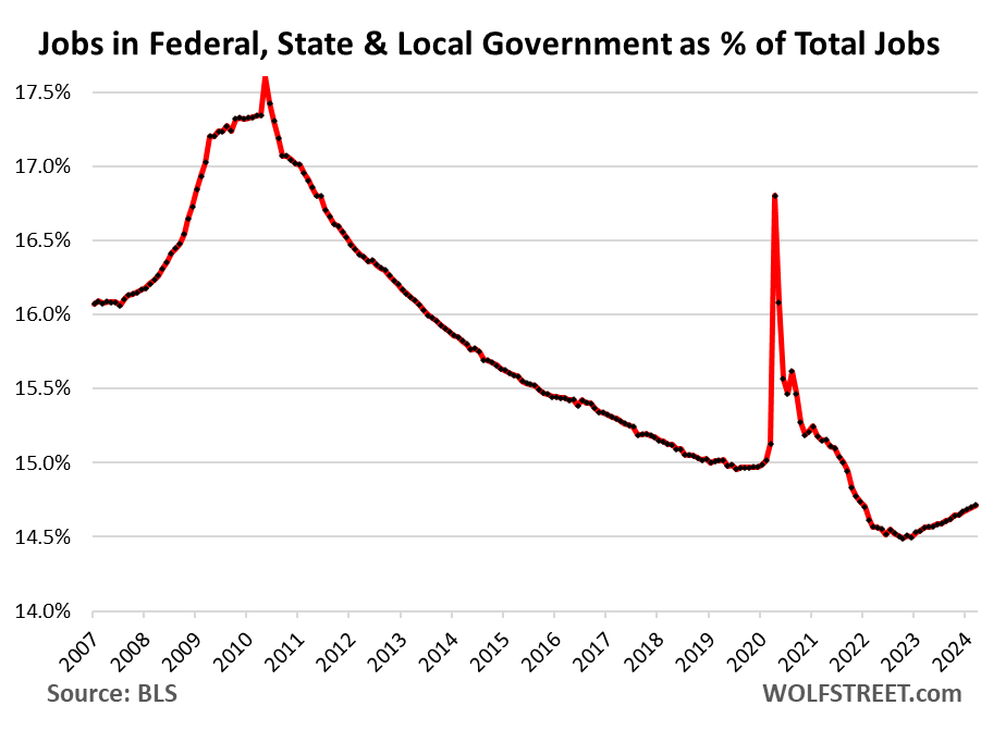 Your way off, percentage of government jobs is over close to 50% if not over, the create nothing do not contribute anything to GDP. Liesure and hospitality are low paying jobs. Manufacturing jobs zero. Waiting for that investments in America act to kick in like Obamas shovel ready jobs that didn’t exist. Some good news, The Secretary of Transportation has a hybrid electric car. Looks like Pete still needs fossil fuels.